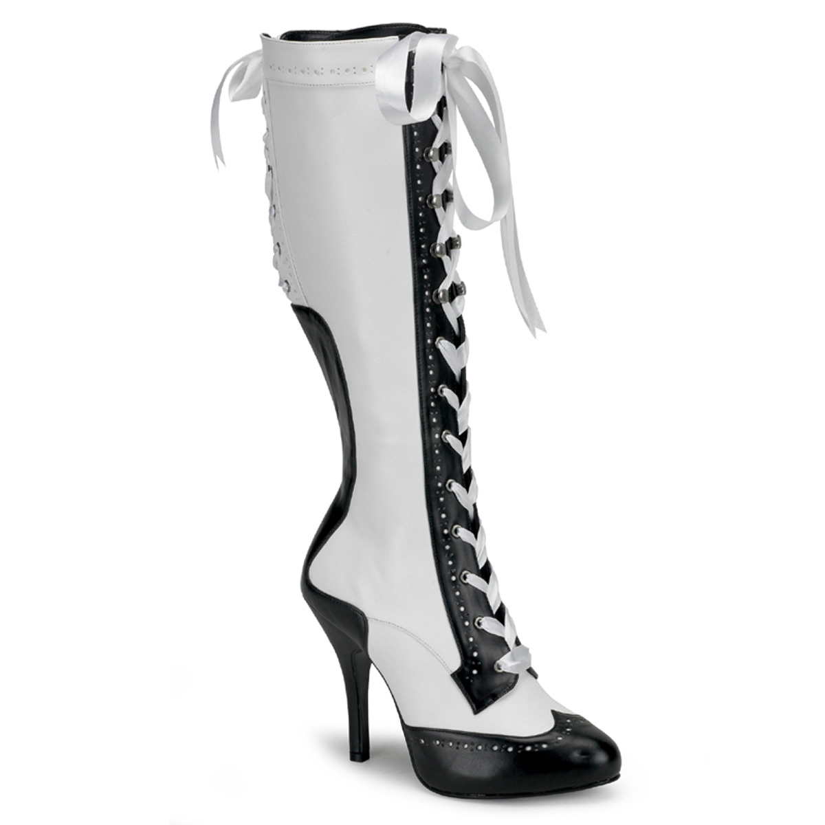 4 1/2"" (11.4cm) Heel, 1/2"" (1.3cm) Concealed Platform, Ribbon Lace Up Two-Tone Knee Boot with Perforated Trim