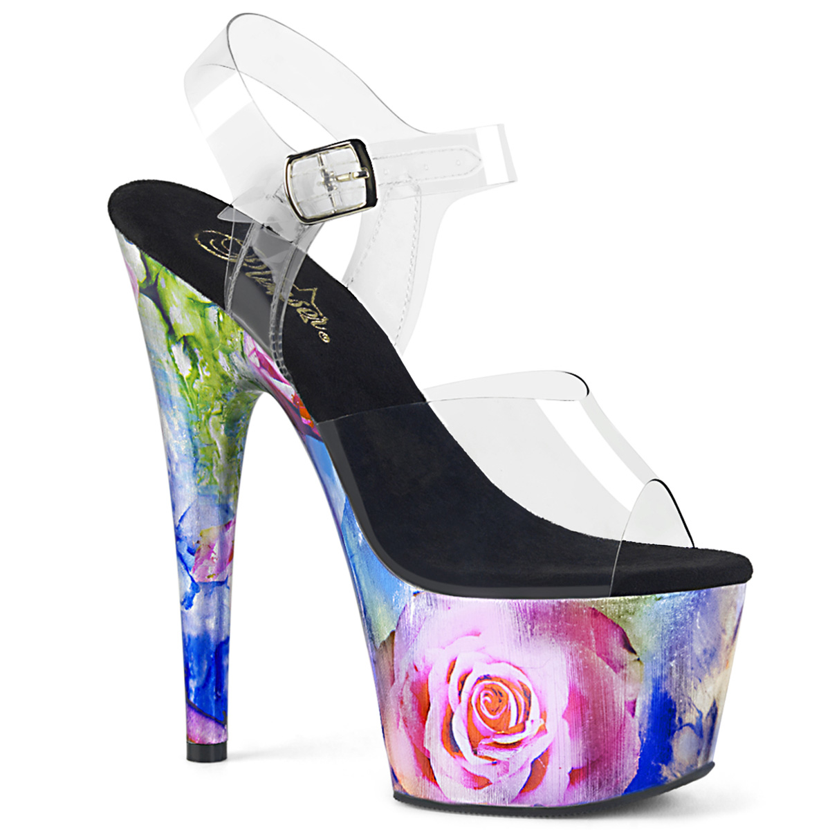 7"" (178mm) Heel, 2 3/4"" (70mm) Platform Ankle Strap Sandal Featuring Metallic Rose Print Platform Bottom