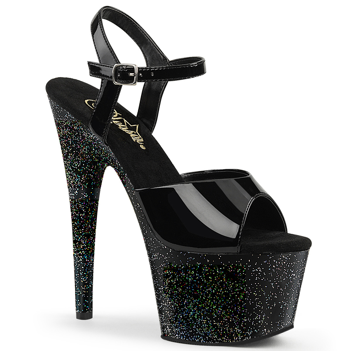 7"" (17.8cm) Stiletto Heel, 2 3/4"" (7cm) Platform Ankle Strap Sandal Featuring Mini Iridescent Glitter on the Entire Platform