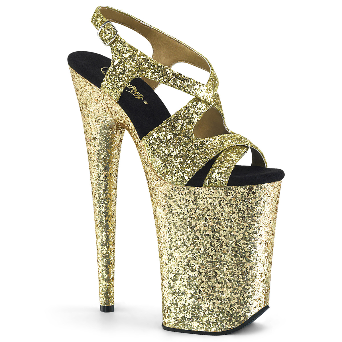 9"" (230mm) Heel, 5 1/4"" (135mm) Platform Double Criss-Cross Sandal Featuring the Entire Platform Bottom Covered w/ Glitters