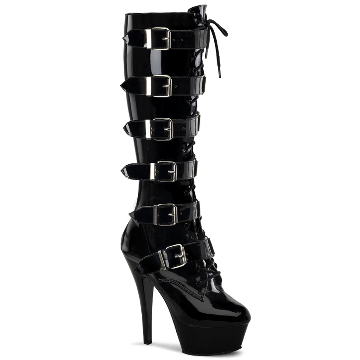 6"" (15.2cm) Heel, 1 3/4"" (4.5cm) Platform Lace Up Front Knee Boot Featuring 6 Buckle Design